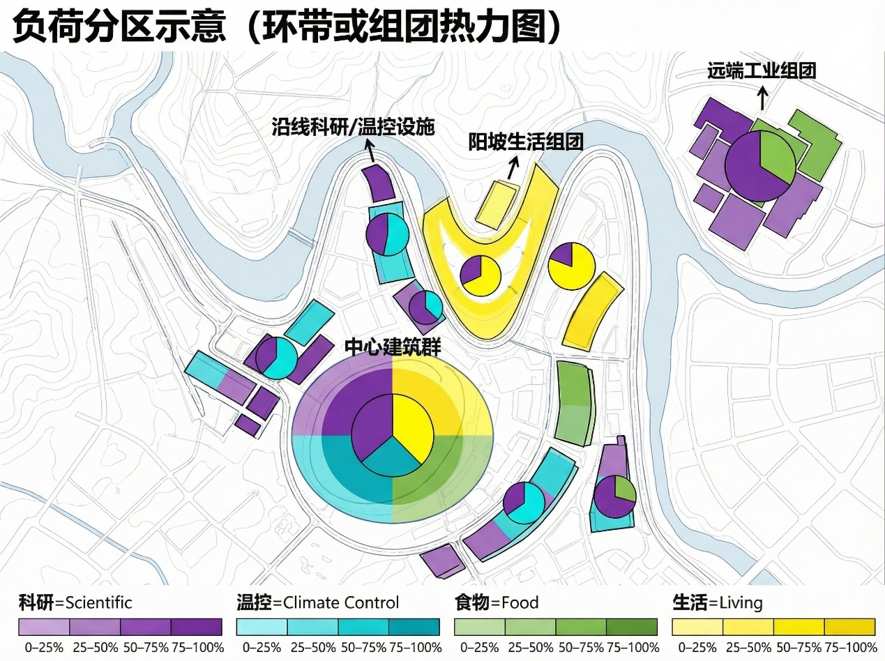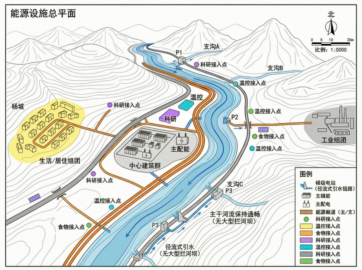 供能边界:以香格里拉高海拔水系为主能,形成多级梯级小水电“源—网—荷—储”闭环,确保生命支持、科研与基本生活连续运行。