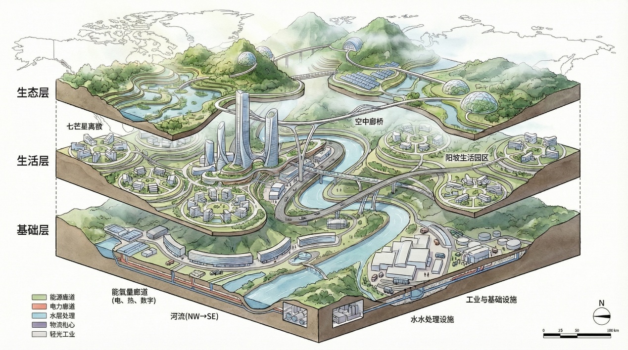 能源、水处理、物流与工业设施布置于下游及地形低点,隐蔽嵌入地形之中,减少对生活层与生态层的直接干扰。