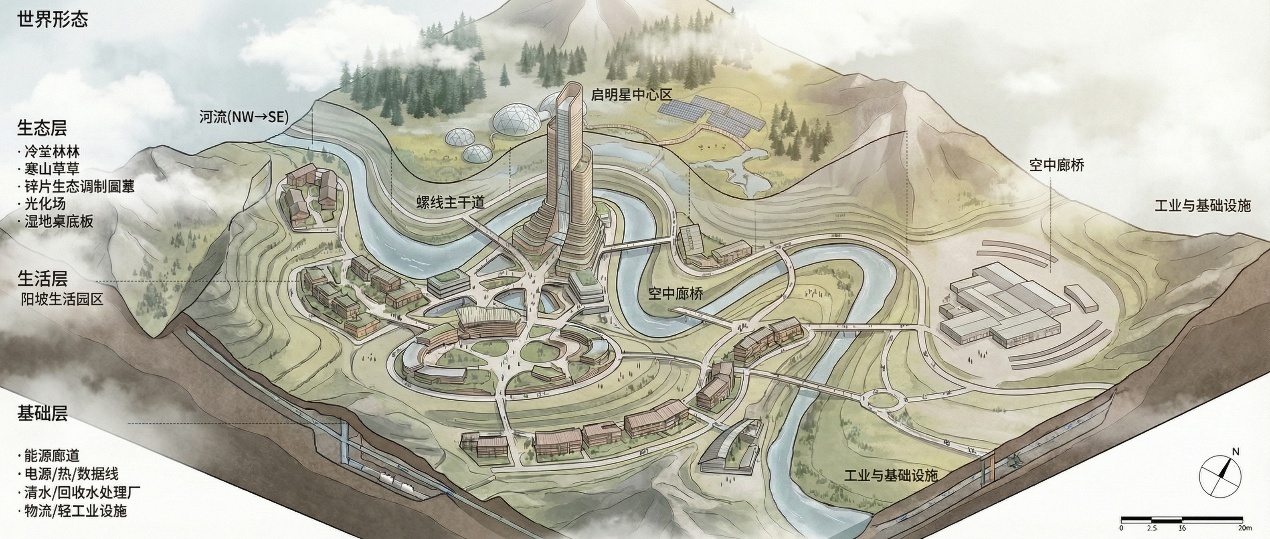 启明星在垂直方向上整合公共服务、文化展示、交通换乘与部分管理功能,与七大园区通过非线性(螺线形)道路与空中连廊建立直接联系,形成整个世界的结构核心与精神中心。