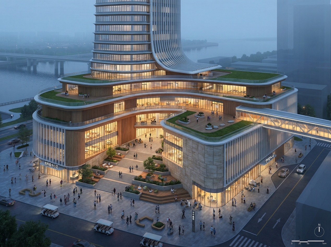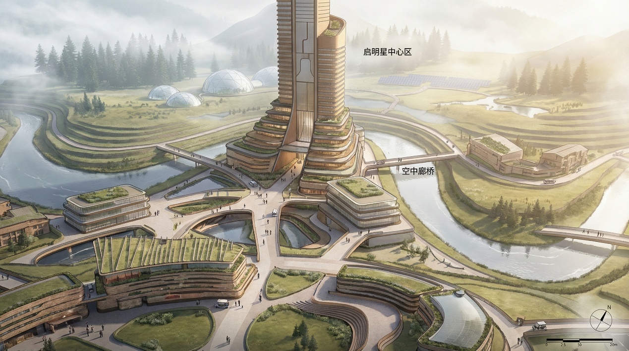通过七大居住园区的环状分布、垂直向度上的功能分层,以及连续水系与交通骨架的串联,构建一个高效运行、结构清晰、与自然环境高度耦合的人居系统。