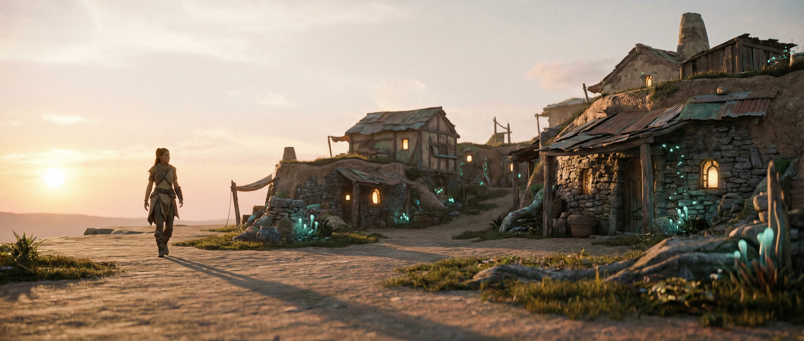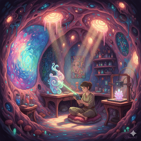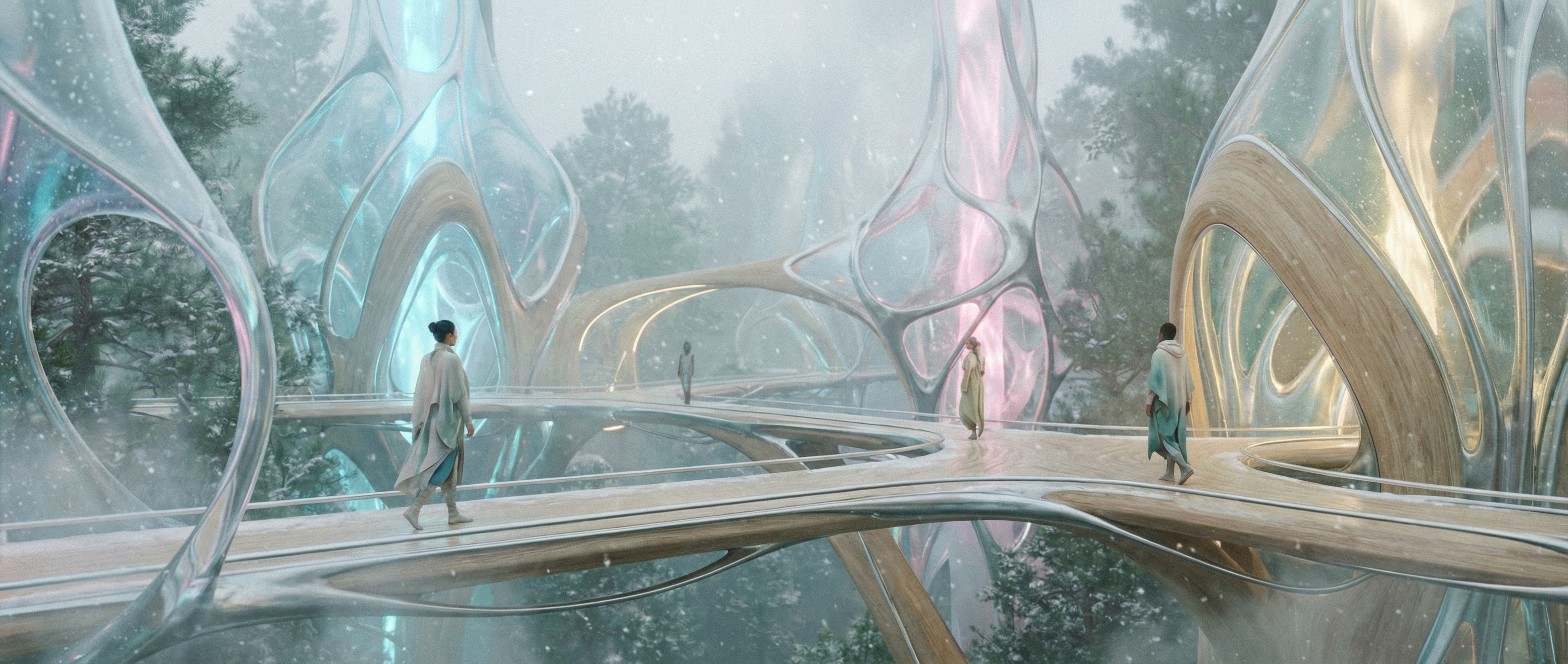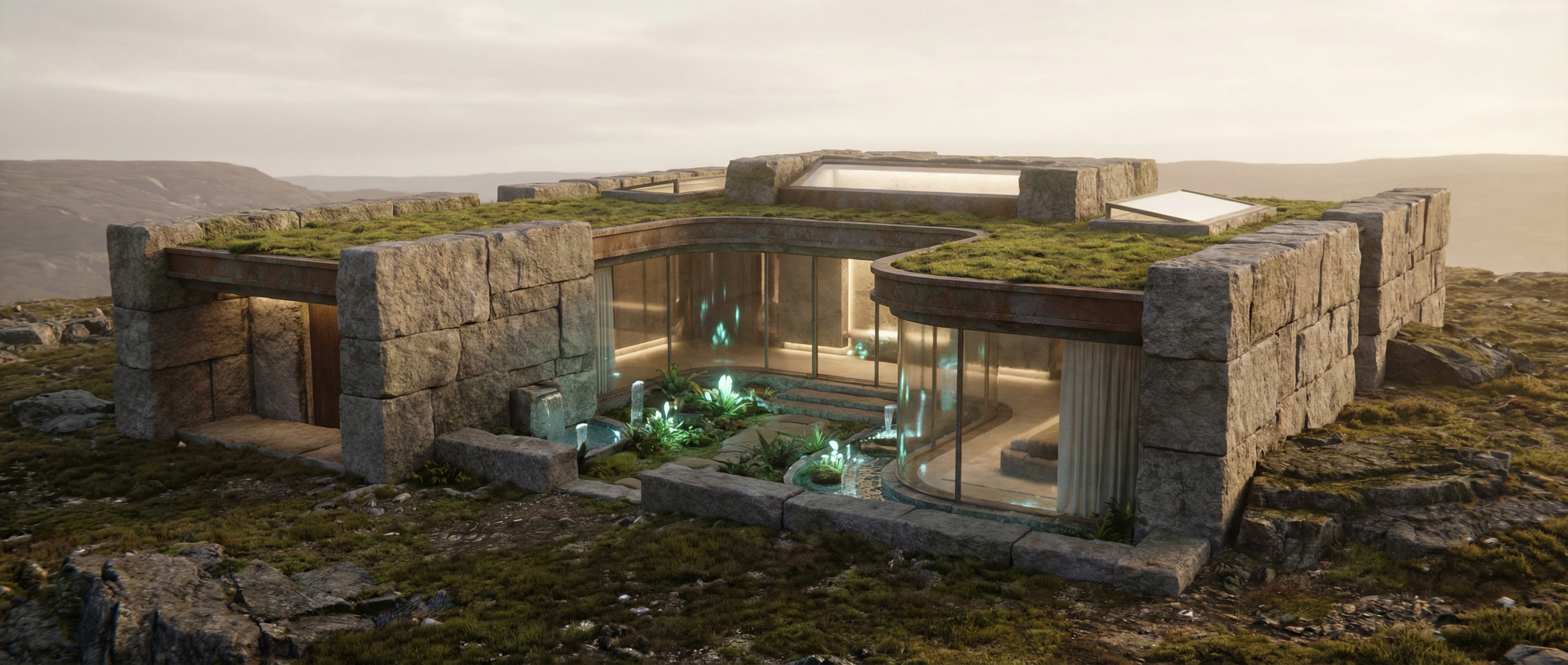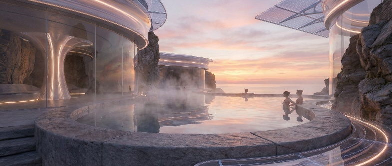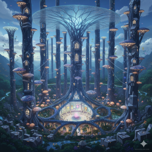 我们做饭用菌丝分解炉,取暖靠太阳墙。建筑都很低矮,屋顶长着本地草种,春天开小紫花,冬天覆薄雪。我的书房有一整面玻璃墙,正对着雪山。写作累了就抬头,看光影在山脊移动,看鹰在绝壁间盘旋。夜里不用电灯,桌上有发光的菌丝灯盏,柔和如萤火。透过玻璃看出去,星空低垂,银河仿佛要流进山谷。
