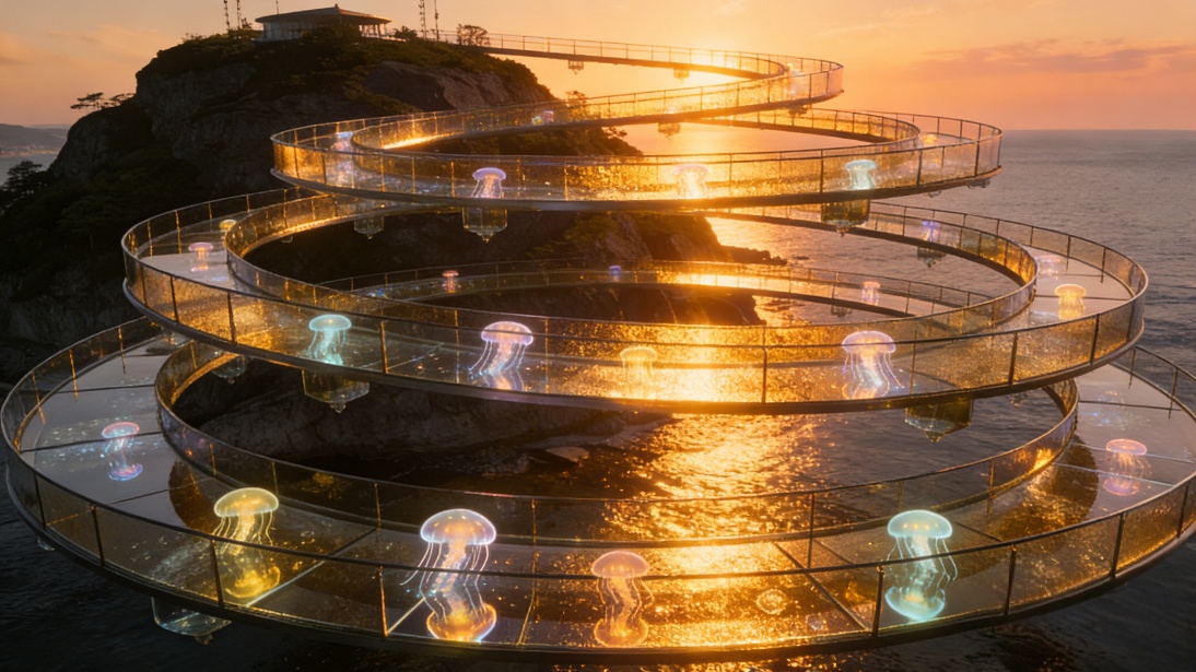 螺线形主干道串联各园区,放射状步道与空中廊桥连接不同高度的生活与公共空间,形成“环 + 放射”的立体交通体系。