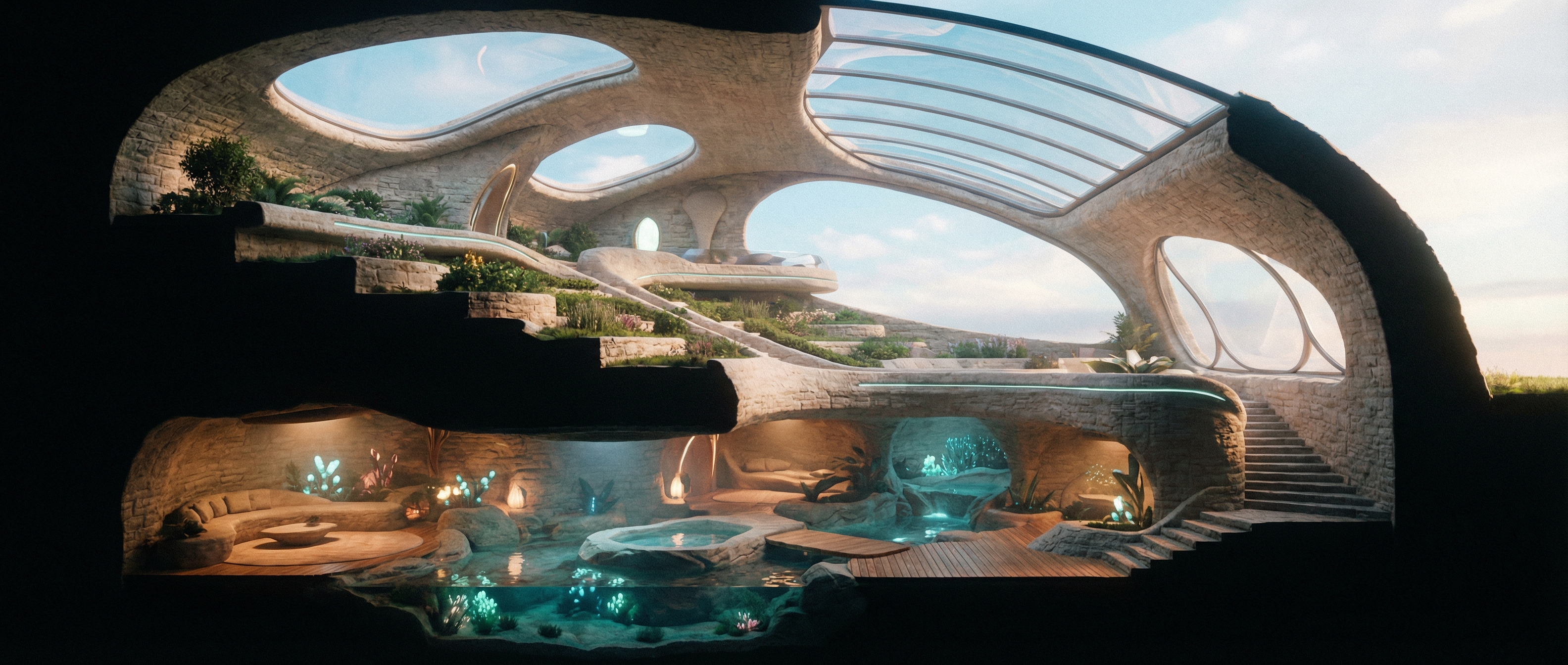 模拟云南高山植被与云雾气候条件,布置生态调节穹顶、自然游憩空间及部分光伏设施,用于环境调节、生态体验与公共活动。中部(生活层)